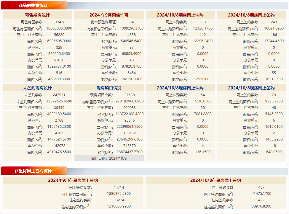 根据北京市住房和城乡建设委员会数据:10月8日,北京新房住宅网签234套,网签面积22,389.84㎡;二手房住宅网签422套,网签面积约38976.82㎡。