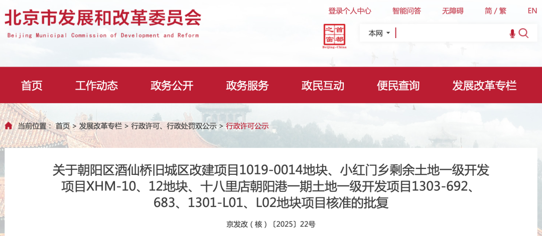 北京市发改委官网发布了一条核准批复《关于朝阳区酒仙桥旧城区改建项目1019-0014地块、小红门乡剩余土地一级开发项目10、12地块、十八里店朝阳港一期土地一级开发项目1303-692、683、1301-L01、L02地块项目核准的批复》。