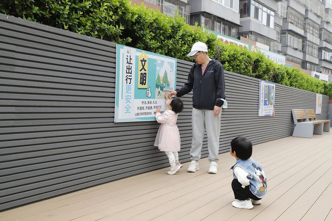 在旺泉街道石门中街的休闲文化角,居民正带着孩子了解公益广告牌上的文明标语。旺泉街道聚焦居民休闲娱乐需求,精心规划街巷布局,补种绿植、增设长椅、布置公益广告宣传栏,并安排专人定期巡查维护,让居民在家门口就能享受惬意时光。