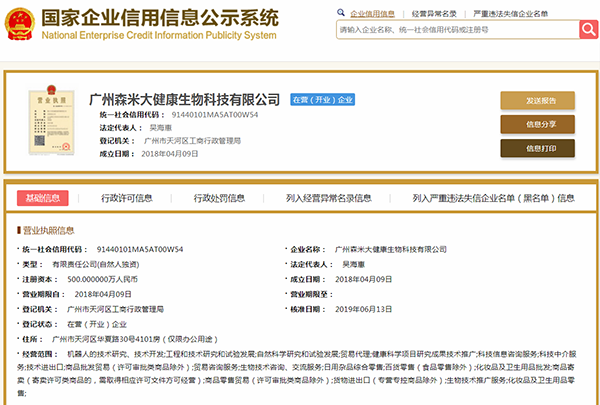 国家企业信用信息公示系统显示的资料显示,经营范围包括机器人的技术研究、技术开发;商品批发贸易(许可审批类商品除外);日用杂品综合零售;百货零售(食品零售除外)等,但没有显示与食品有关的经营项目。然而,其行政许可信息却显示,森米有食品经营许可证,许可内容为预包装食品销售(不含冷餐冷冻食品),许可机关是广州市天河区食品药品监督管理局。