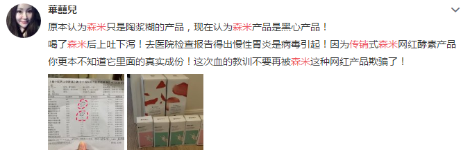 部分投诉者表示,森米产品是黑心产品,喝了森米后上吐下泻,去医院检查报告得出慢性胃炎是病毒引起。因为传销式森米网红酵素产品你更本不知道它里面的真实成份,这次血的教训不要再被森米这种网红产品欺骗了。