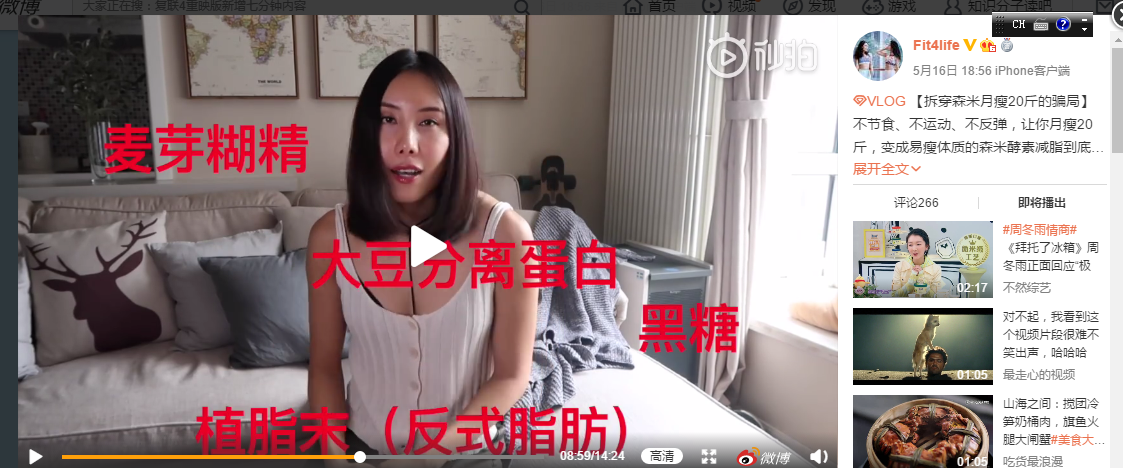 知名运动博主Fit4life还在微博发布视频,来拆穿了森米月瘦20斤的骗局。她在视频中表示,吃森米之所以瘦了,是靠每天的节食产生能量缺口造成的,跟森米半毛钱关系都没有。酵素实际上是一种酶,吃酵素补充酶不如吃多酶片,森米的代餐产品中的某些配料实际上都没有奶茶健康。