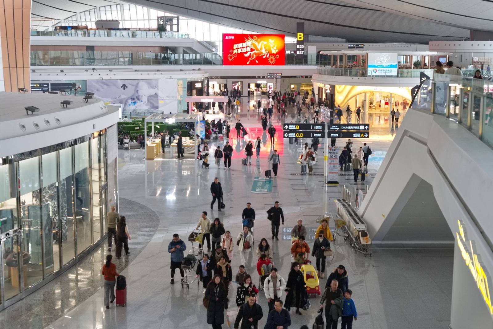 走进大兴机场航站楼,连廊亮化、主题宫灯焕新、灯笼挂件装饰、主视觉轮播等布置,营造出“一路年味随行”的浓厚新春氛围。大兴机场开展“兴兴陪你过大年”主题活动,推出便捷出行、特色商业、文化体验、暖心服务等系列举措,生动塑造“小兴兴”IP形象,深化旅客感知与情感共鸣。不仅联合首都博物馆在E指廊国际出发区推出“北京史·国潮”主题展,通过四个展区、二十三件展品展现首都文化脉络,还将与首都图书馆合作举办元宵喜乐会、猜灯谜活动。此外,“归兴肆见”新春市集、“加马过大年”快闪即将启动,现场设置祈福挂牌、集章打卡等互动环节,打造D60“春运回家”主题登机口,将春节氛围沉浸式延伸至旅客动线之中,让春运旅途充满温情记忆。