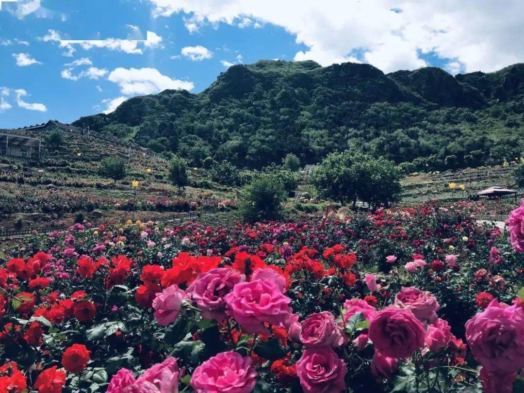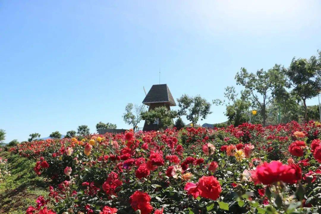 这里种植玫瑰、月季1500多亩13万株,其中有藤本月季、丰花月季、地被月季等近300个品种,还种植有柳叶马鞭草、罗勒、金光菊等十多种香草植物,是初夏全家休闲度假的好去处。