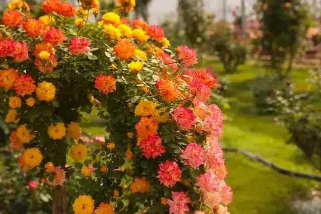 目前,花乡公园内有九大系列两百多种月季。其中,藤本月季有“光谱”“御用马车”等品种;大花观赏月季不仅保留了传统“红双喜”等品种,还增添了香气馥郁的“吉普赛女郎”;“果汁阳台”“红苹果”“火龙果”“迷你月季”等品种色彩丰富、婀娜多姿,更有古桩独本树状月季、造型月季等独特品种点缀园中,营造出梦幻多彩的“月季派对”。