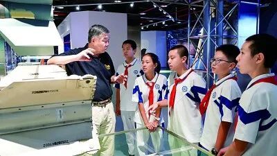 北京航空航天博物馆首席专家韩国军(左)向北航附中的同学们讲授我国航空航天事业发展历程。北京航空航天大学供图