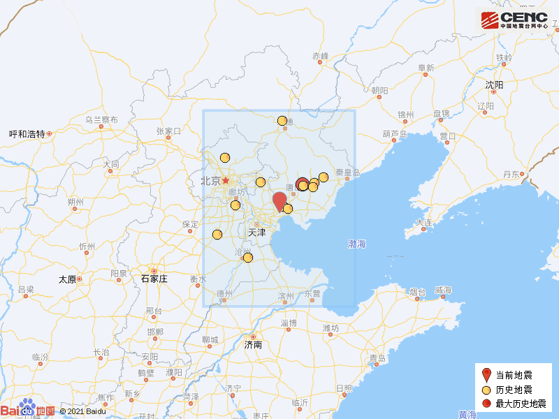历史地震:根据中国地震台网速报目录,震中周边200公里内近5年来发生3级以上地震共13次,最大地震是2020年7月12日在河北唐山市古冶区发生的5.1级地震(距离本次震中72公里),历史地震分布如图。