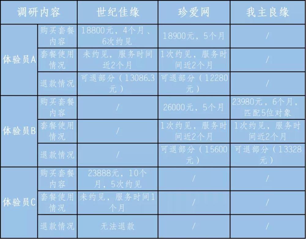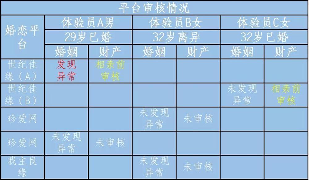 对于平台客服所说的“安全性高”这一点,体验员在门店体察时也重点关注。结果显示,珍爱网和我主良缘对于会员婚姻和财产状况并无审核,世纪佳缘不同门店对于会员婚姻的审核也不尽相同,其中,世纪佳缘A店在会员缴费后隔日查出体验员婚姻状况有异,但是B店并未查出任何不妥。