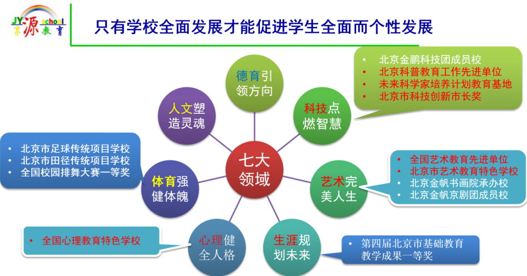 学校坚持面向全体学生,以学校的全面发展,保障和促进学生的全面而有个性的发展。学校拥有健全、丰富的课程体系,拥有“北京市金帆书画院”、“北京市金鹏科技团”、“北京市金帆京剧团”等多个高水平社团,荣获“全国教育先进集体”称号。
