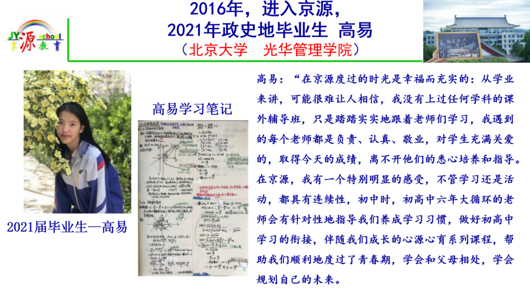 京源学校高考成绩斐然,众多学子升入清华、北大、人大、复旦、中央美院等一流院校。2020年,学校被授予清华大学优秀生源基地校。依托学校对于学生综合能力和素养的切实提升和助力,从京源走出的学子们发展后劲十足,许多学生在本科毕业后进入清华、北大进行研究生阶段的深造学习。
