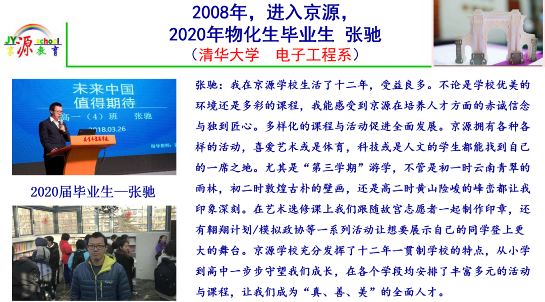 拔尖创新人才培养:作为北京市首批翱翔计划基地校,学校开设了北京市拔尖创新人才培养课程,采用高校教授、北京市创新教育办公室及京源学校“三导师”培养机制,对学有余力的学生进行创新型、个性化培养。
