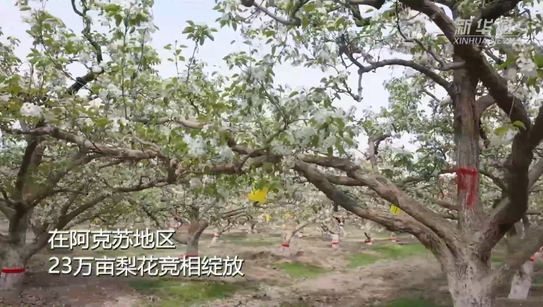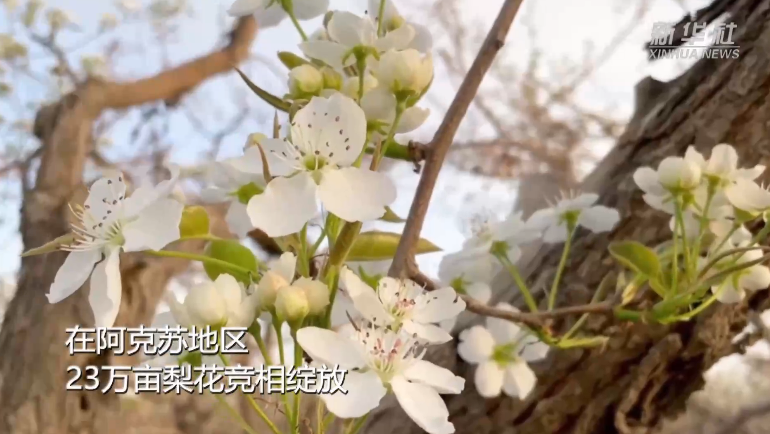 淡淡梨花白,又闻梨花香。时下,正是新疆梨花盛放时节。在阿克苏地区,23万亩梨花竞相绽放。远远望去,莹白如雪,如团团云絮,漫卷轻飘,美不胜收,惹人沉醉。