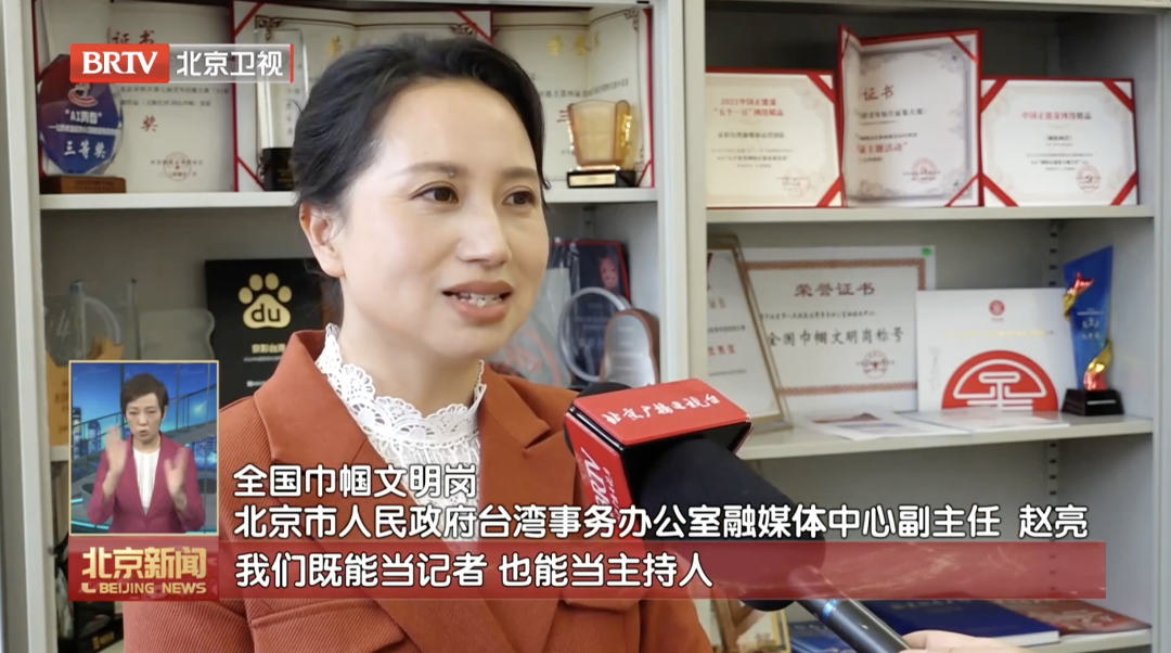 全国巾帼文明岗、北京市人民政府台湾事务办公室融媒体中心副主任赵亮说:“‘京彩台湾’团队中的女生都是多面手,我们既能当记者,也能当主持人,既能写文章,也能搞设计。我们将以全国巾帼文明岗的荣誉为新的起点,携手两岸同胞,为民族复兴和祖国统一贡献‘京彩’力量。”