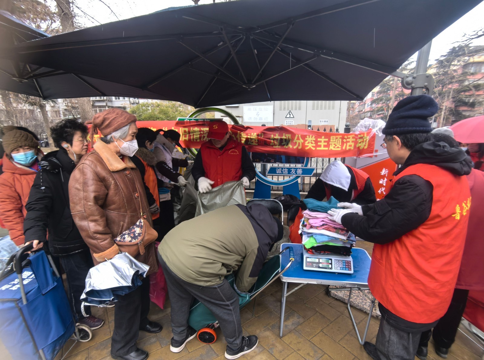 本次活动吸引了来往居民的关注,不少居民闻讯而来,将打包好的旧衣物送了过来。很快,活动现场堆满了大包小包的旧衣物。大家把尺寸不合适的、多年闲置的旧衣物拿出来,希望能够物尽其用、减少浪费。工作人员认真做好旧衣物登记,并现场称重、兑现。