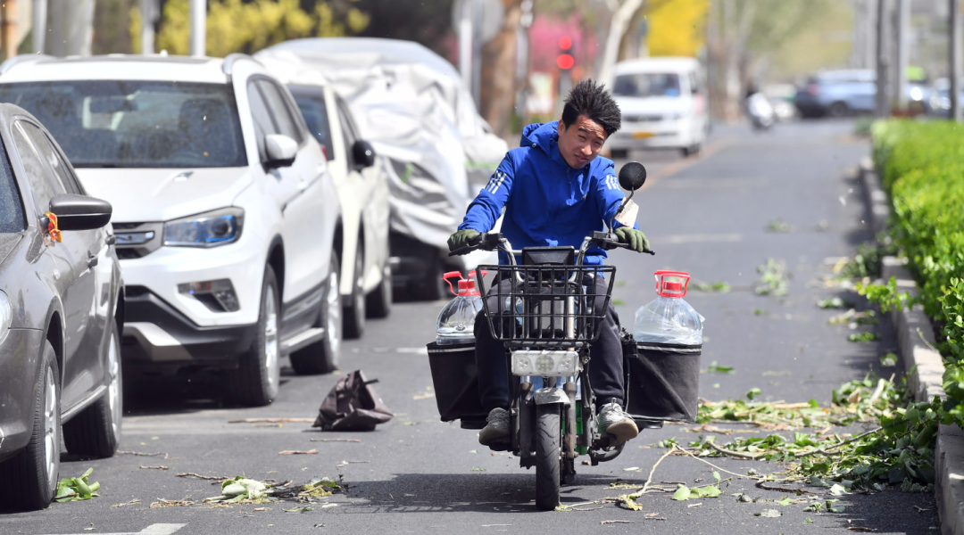4月12日,在北京通马路,外卖骑手在大风中前行。蔡代征摄