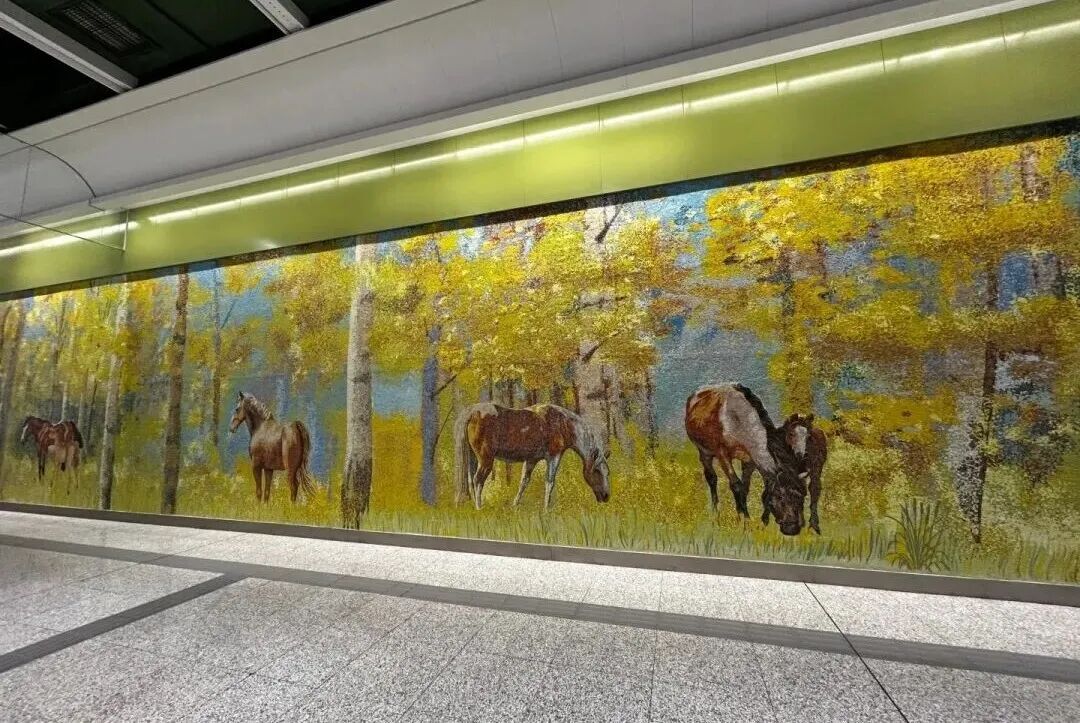 值得一提的是,在12号线马甸桥站站厅,有一幅名为“城外秋歌”的壁画,作品以马甸地区丰富的历史背景和特有的文化属性为题材,创作出秋郊放牧的景象,以马赛克的方式绘制出一幅色彩丰富的油画。