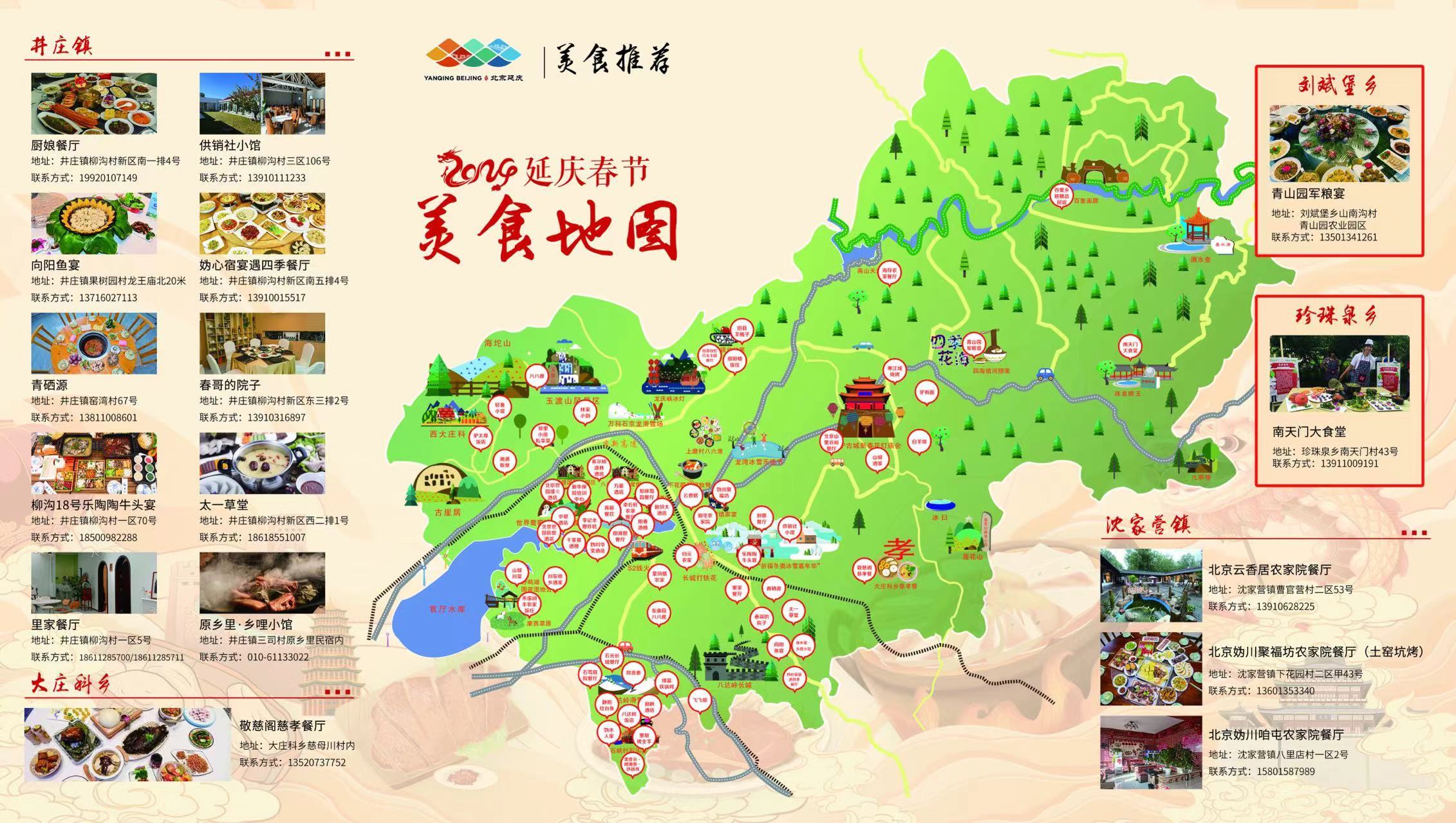 地图囊括地域景点、地道美食、地区酒店,覆盖张山营、八达岭、旧县、井庄等延庆14个乡镇,既有星级酒店的精品美食,也有特色民宿的乡村家宴。育新餐饮的长城家宴、中银酒店的龙凤呈祥宴、永宁古城的寒江城烧烤、石光长城民宿的扒猪脸等均包含在内。