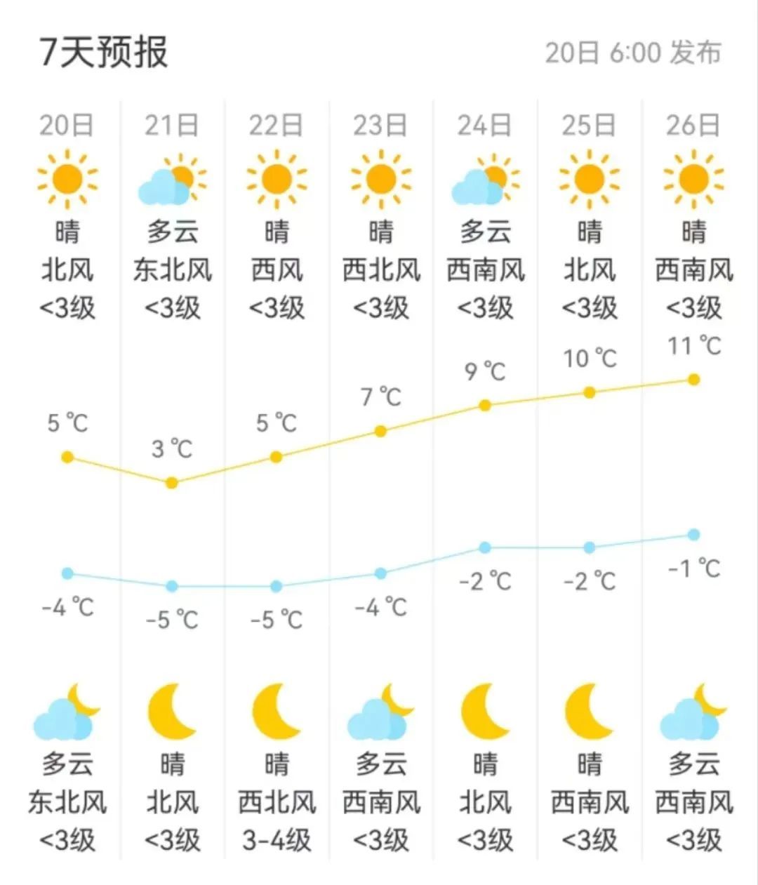 20日夜间,晴转多云,南转北风,2级左右,最低气温-5℃。