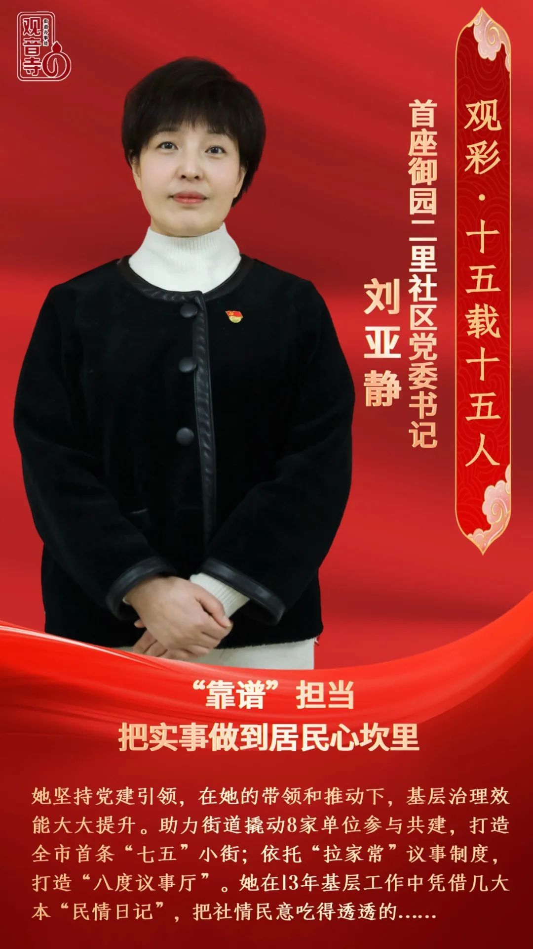 她坚持党建引领,在她的带领和推动下,基层治理效能大大提升。助力街道撬动8家单位参与共建,依托“拉家常”议事制度,打造“八度议事厅”。她在13年基层工作中凭借几大本“民情日记”,把社情民意吃得透透的……2023年9月,首座御园二里社区入选大兴“城市党建案例”。她就是观音寺街道首座御园二里社区党委书记刘亚静,社区居民都说她是“靠谱”担当 ,总是把实事做到居民心坎里。