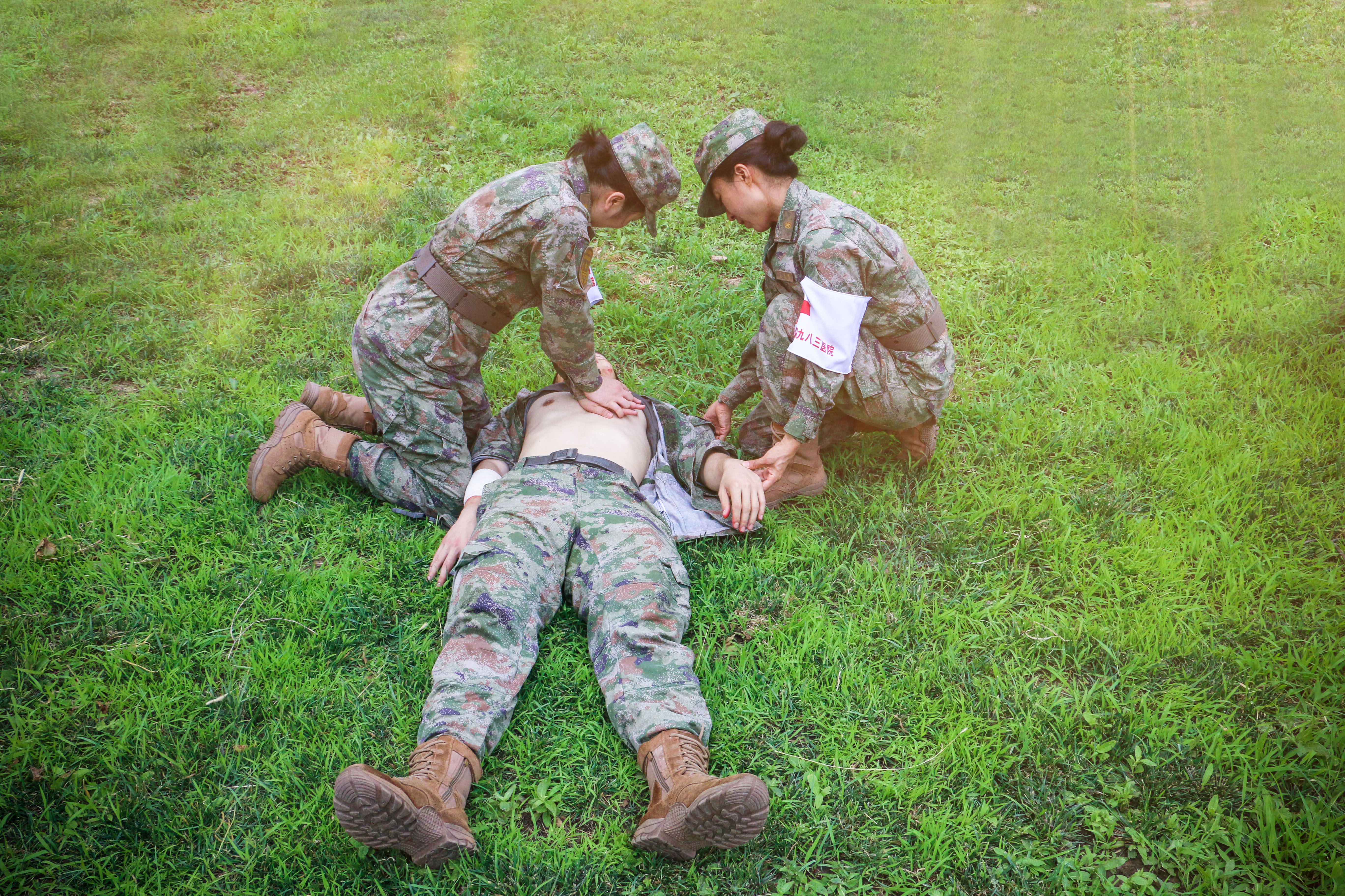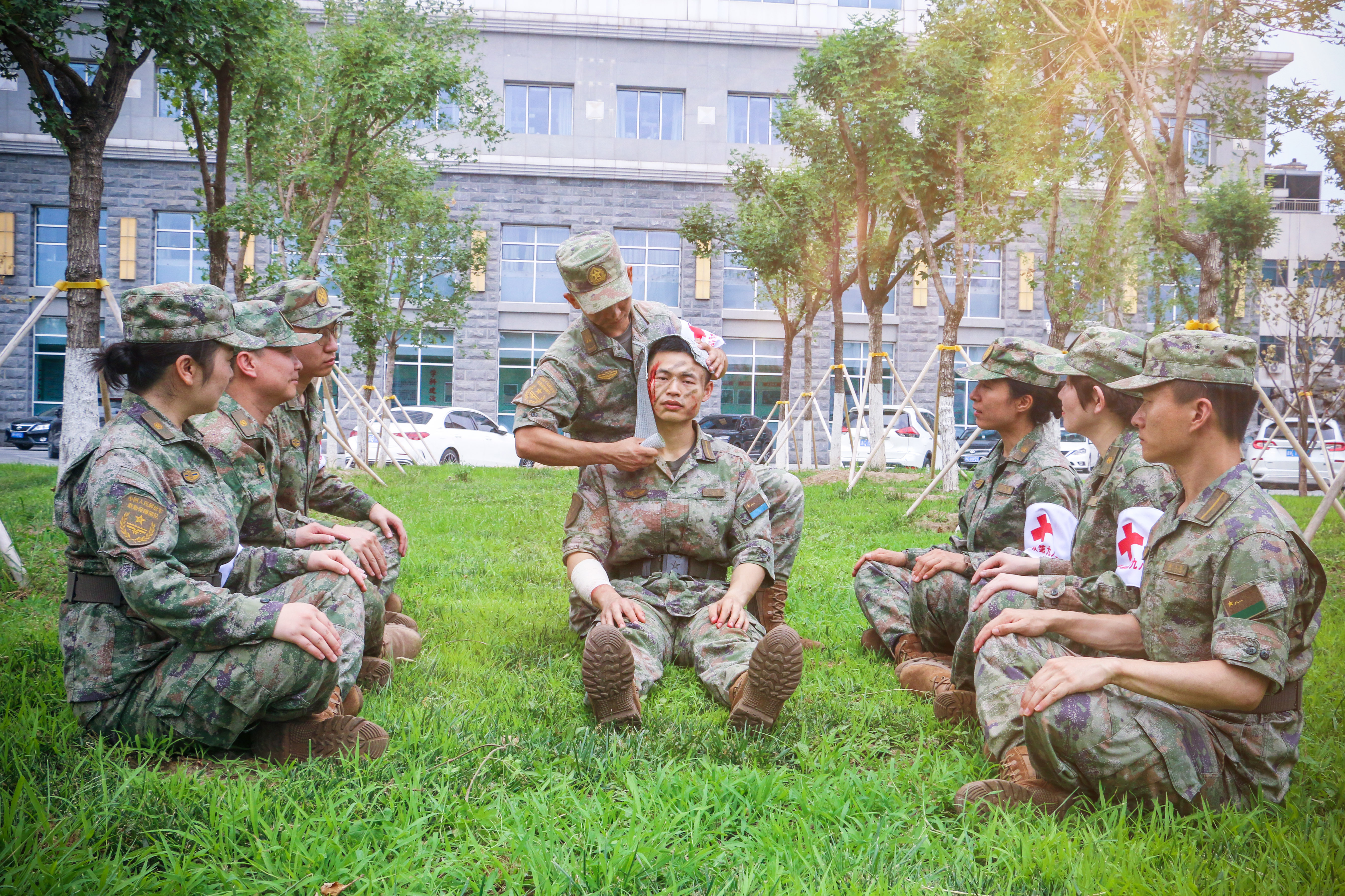 “前方发现伤员,立即支援救治!”随着指令下达,救护人员顶着烈日,在高温环境下快速穿越草地通过封锁线,汗水浸透迷彩服却丝毫未减慢前进脚步。模拟战场上,救护人员迅速判定环境安全,随即展开救治——解除装备、判断伤情、安抚“伤员”,一气呵成完成止血、包扎、固定等流程,动作麻利精准。