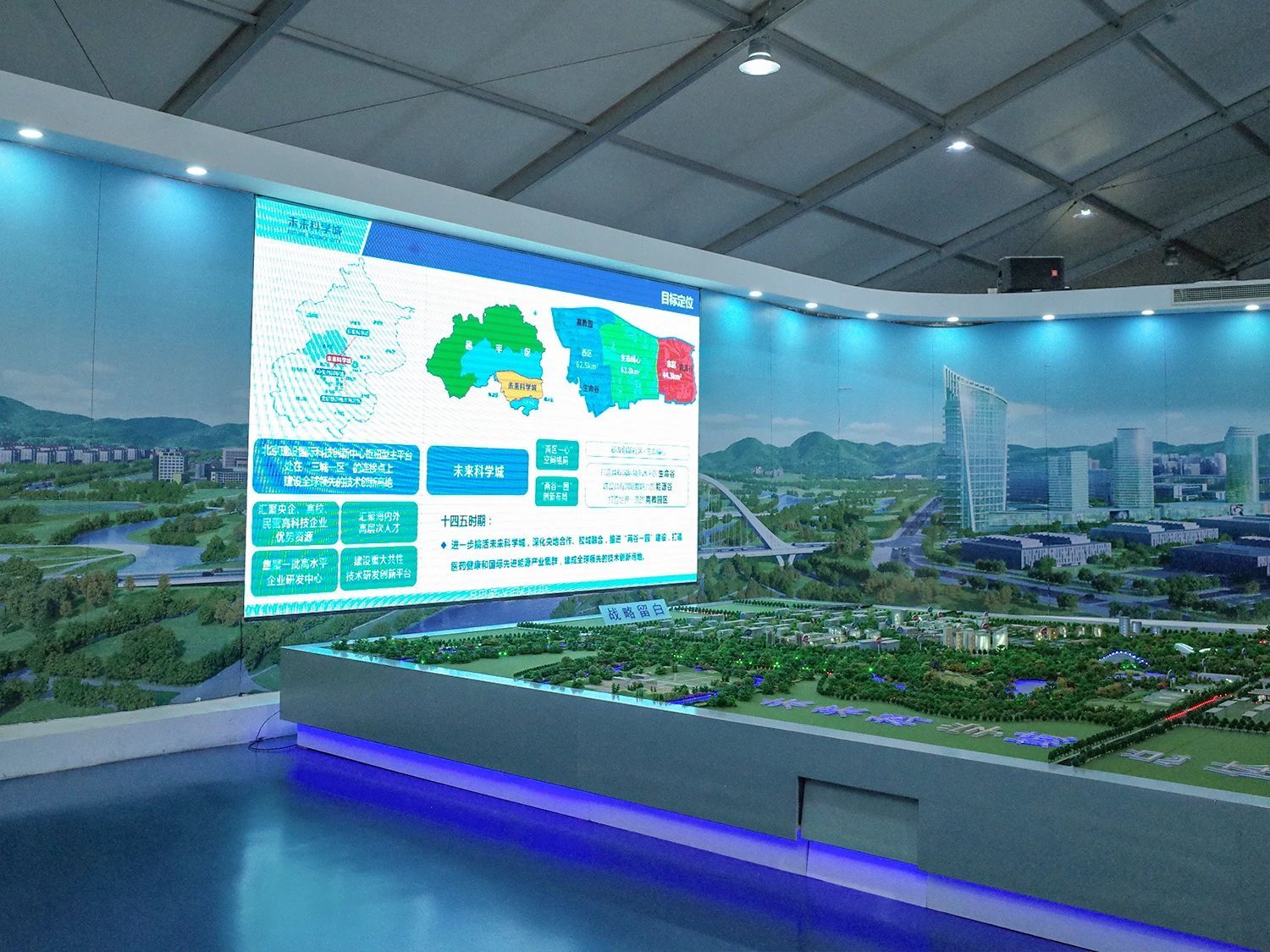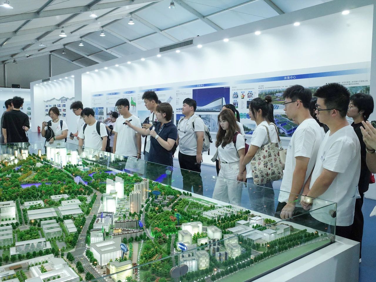 研学实践团先来到第一站——未来科学城展厅。在展厅负责人引领讲解下,研学实践团一行人驻足观看介绍短片,了解未来科学城整体布局和发展战略。随后,同学们依次参观高新技术展品及当前创新成果。来到未来科学城沙盘模型前,一座崭新的现代化科技之城雏形完整呈现在同学们眼前。