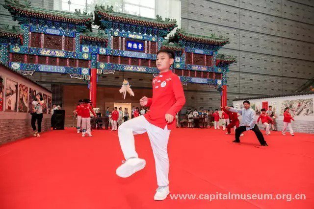 首博一层大厅的景德街牌楼前方,矗立起两道仿制的四合院围墙,形成了一个类似院落的空间,孩子们在其中踢毽子、抖空竹、跟着师傅打太极拳。