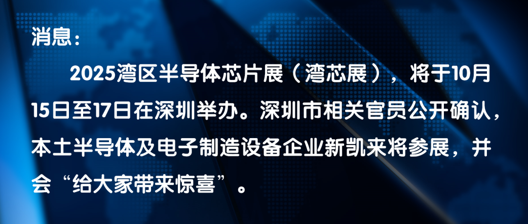 消息:2025湾区半导体芯片展(湾芯展),将于10月15日至17日在深圳举办。深圳市相关官员公开确认,本土半导体及电子制造设备企业新凯来将参展,并会“给大家带来惊喜”。