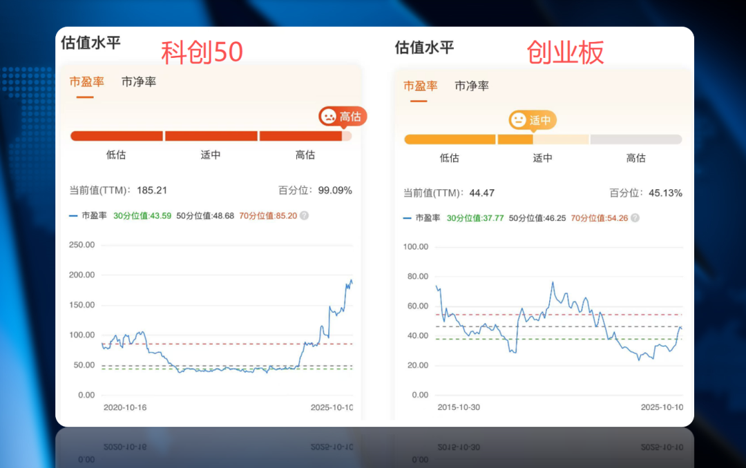 再来关注最强的双创指数,从估值上看,创业板估值适中,但科创50已经到达了高估的位置(历史分位99%)。