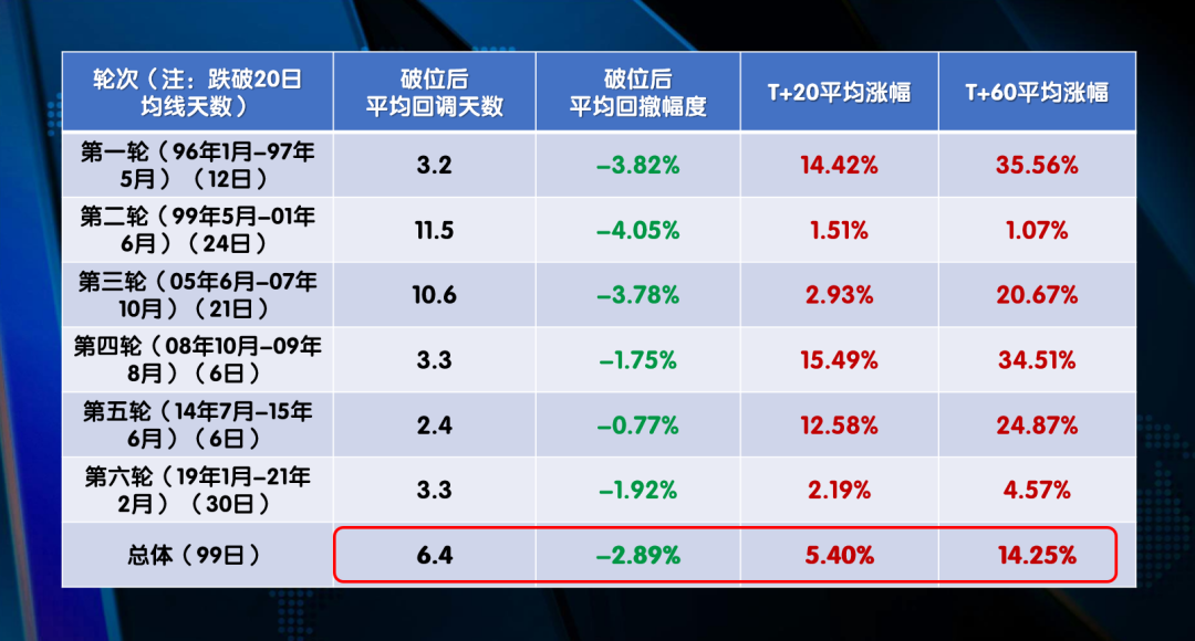 为了更好的看清市场趋势,我们也找到了一组历史上牛市跌破20日线之后的历史复盘数据: