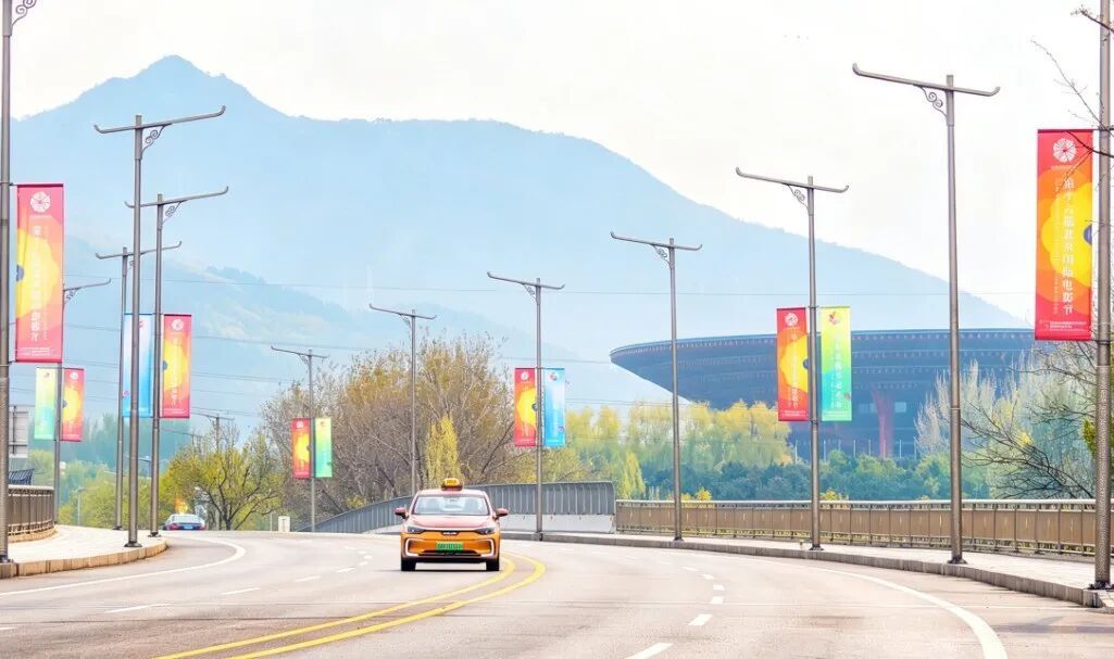 此外,在京承高速14出口处,“‘天坛映百花·光影耀京华’跟着北影节来怀柔”字样横幅向广大市民游客发出邀请。在京承高速14出口至雁栖岛、雁栖湖南环路的道路两侧,1000余面北影节道旗随风舞动,让光影氛围一路延伸,为这场影视盛宴注入满满活力。