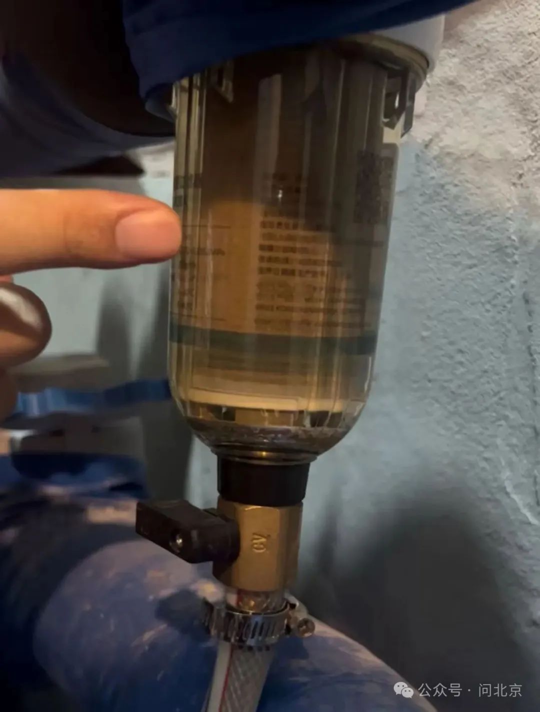 8月6日晚,“问北京”记者来到通州区马驹桥镇的亦庄橡树湾实地探访,在业主张先生家中,他出示了为保障用水安全加装的管道前置过滤器,记者注意到,过滤器与供水管道连接处的滤网已呈深褐色。张先生说: