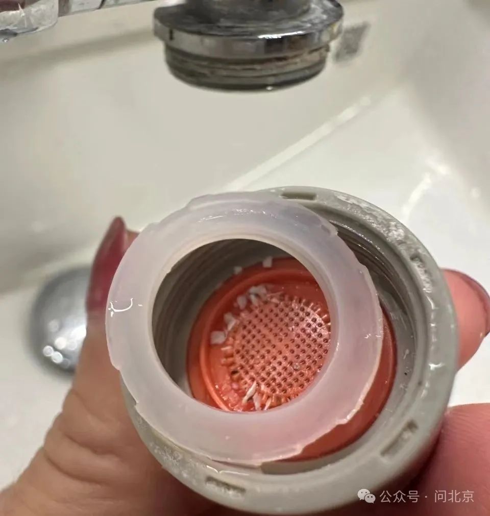 张先生:这个新买的时候里面是白色的,现在你看这边都应该属于沙粒颗粒物了。就是有一次,我家水压比较小,水流很细,我们找物业过来一看,他们说是这里面的颗粒物太多,把进水给堵死了。