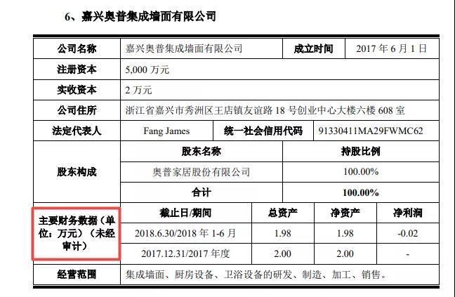 奥普家居较为严重的问题是,其一家控股子公司财务数据未经审计,这家公司由奥普家居100%控股。