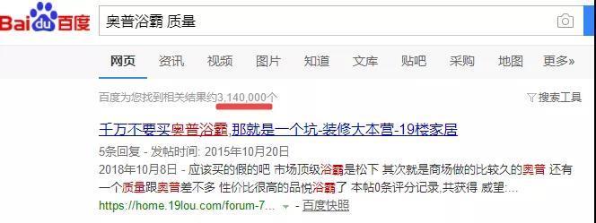 时间财经在百度搜索“奥普浴霸 质量”发现,共出现314万结果,奥普浴霸质量问题被消费者极大关注。