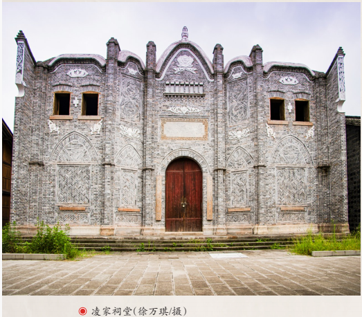 凌氏家祠总面积939平方米,由三进四合院组成,即门庭、中庭、堂屋及厢房,间以天井,四周为青砖黛瓦封火墙体。门庭大门正立面为青砖封火墙式门脸,由青砖、石、少量木材构筑而成。门口镶嵌一副石刻对联:饮水思源蒸尝百代,掌冰著姓昭穆一堂。蒸尝,是旧时大家族在秋冬两季对先祖进行祭祀;昭穆,是宗法制度里对宗庙或墓地的排次,体现家族尊卑和世代繁衍的顺序。