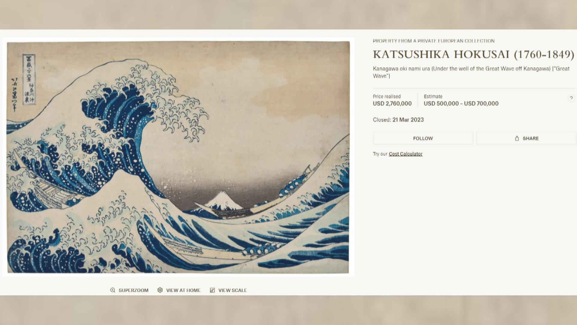 佳士得拍卖行表示,这次拍出的这幅画作保存完好,最终以276万美元的价格成交,创下了葛饰北斋版画作品有史以来的最高价。2021年,另一幅《神奈川冲浪里》曾亮相拍卖会,当时的成交价为159万美元。