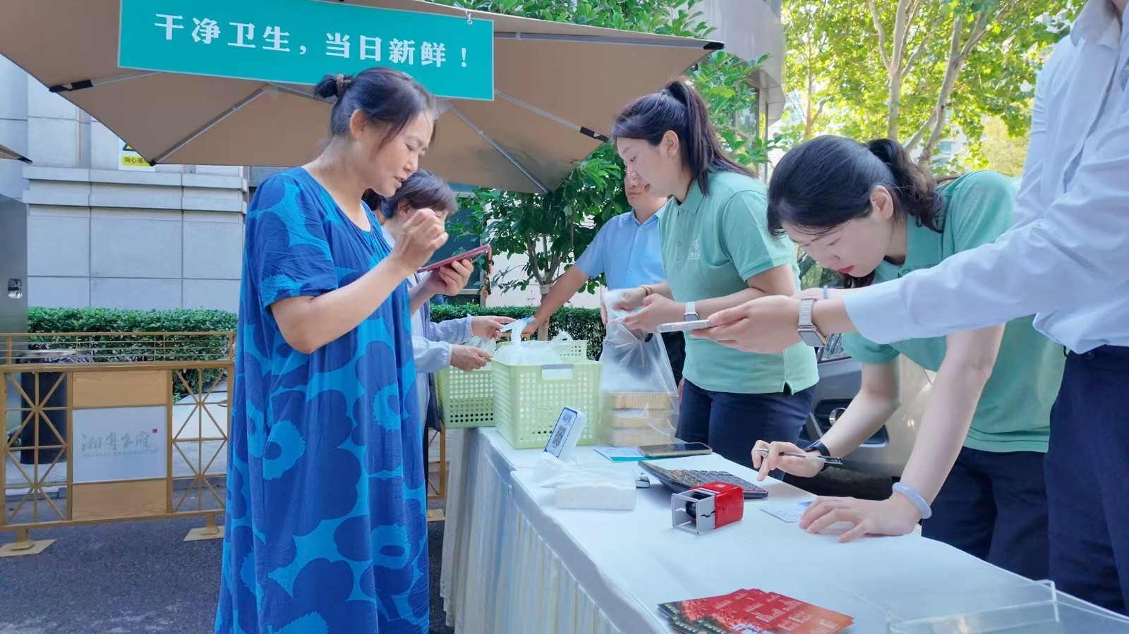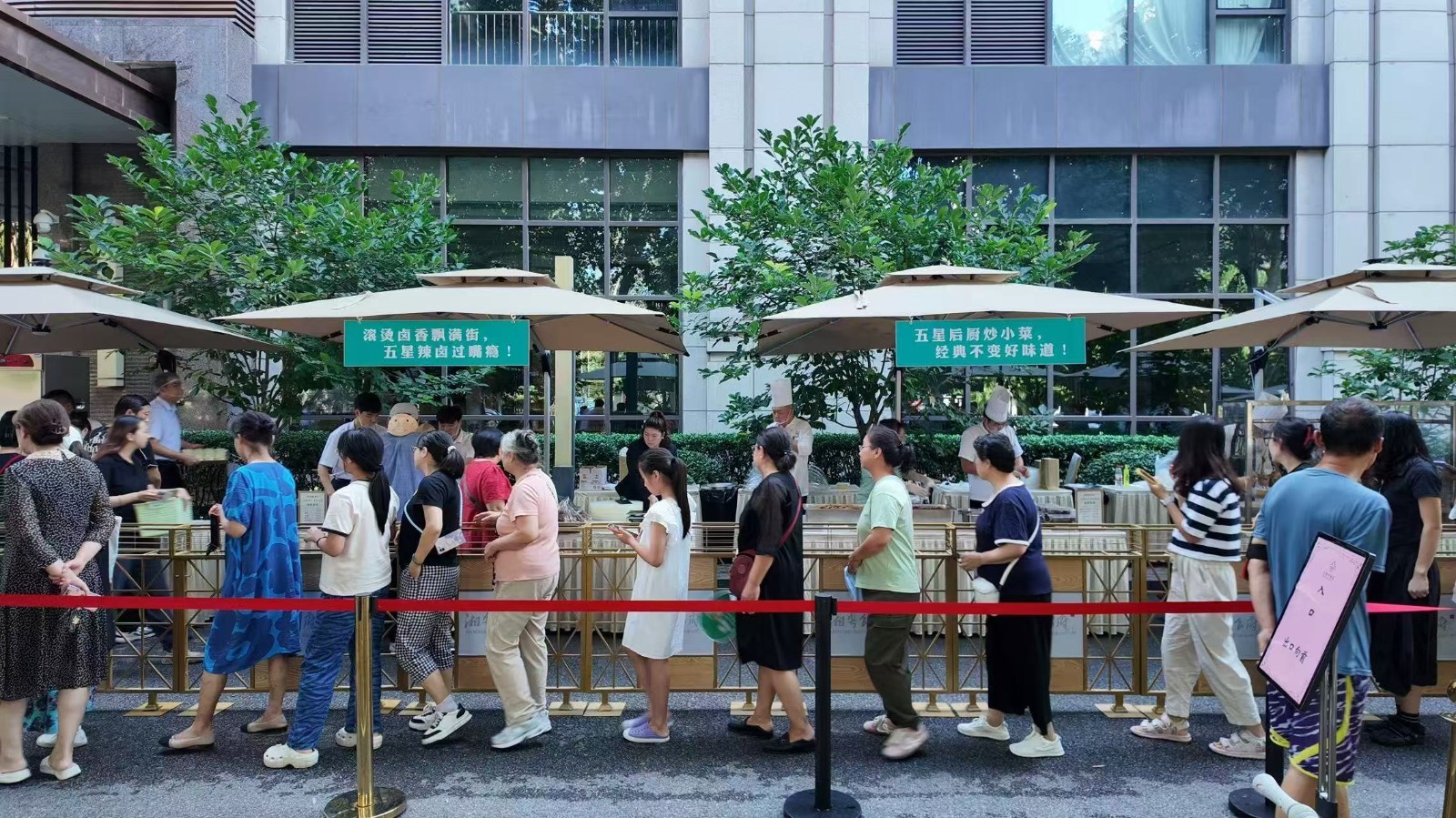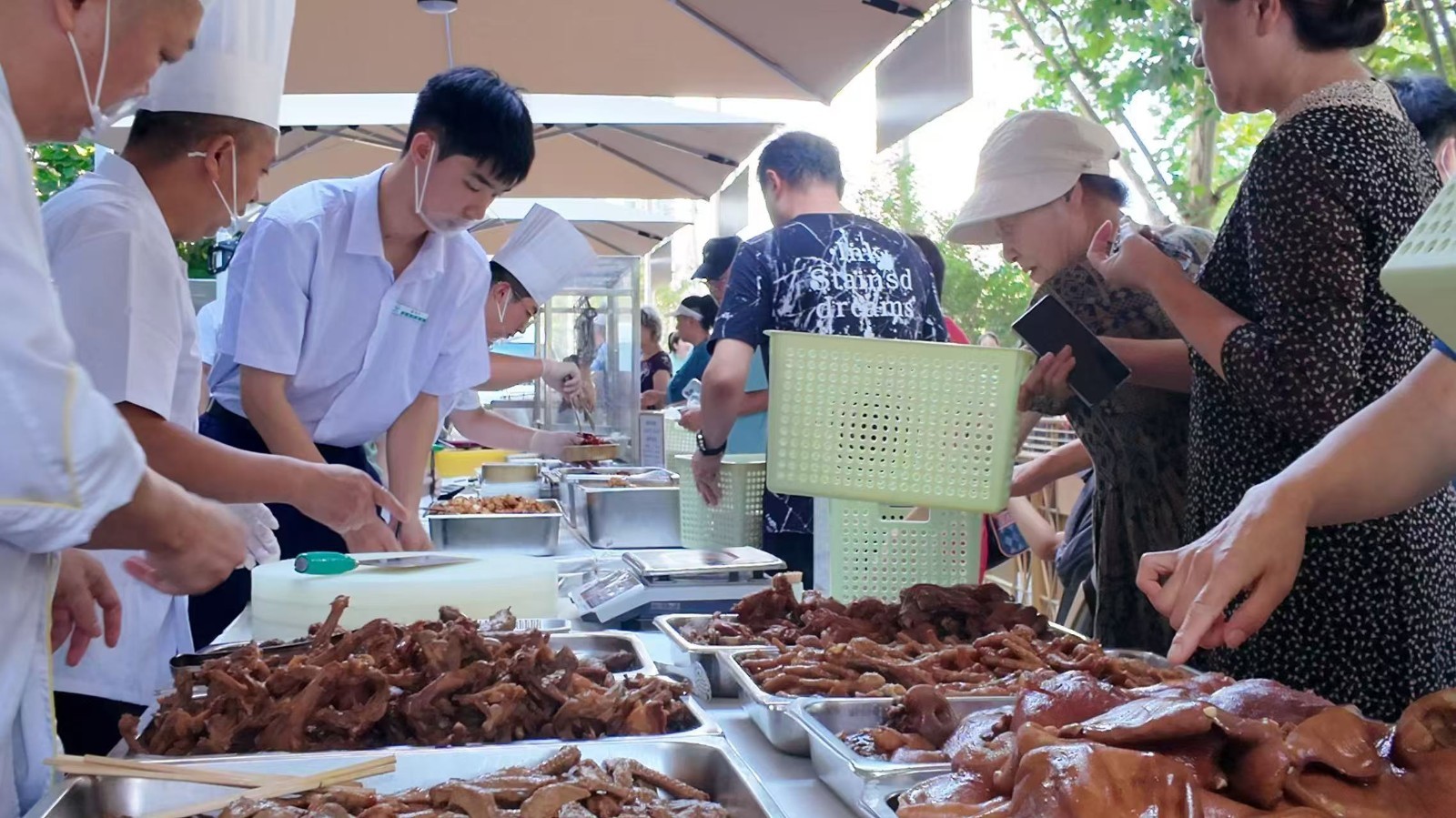 活动现场,戴高帽的厨师们现场娴熟分装,身着制服的服务员热情介绍,共同绘就一道别致的“星级夜市”风景,外摆集市沿用宴会标准工艺,把人均数百元的自助餐同款美味,精心装入外卖盒,让特色美味食品更亲民。