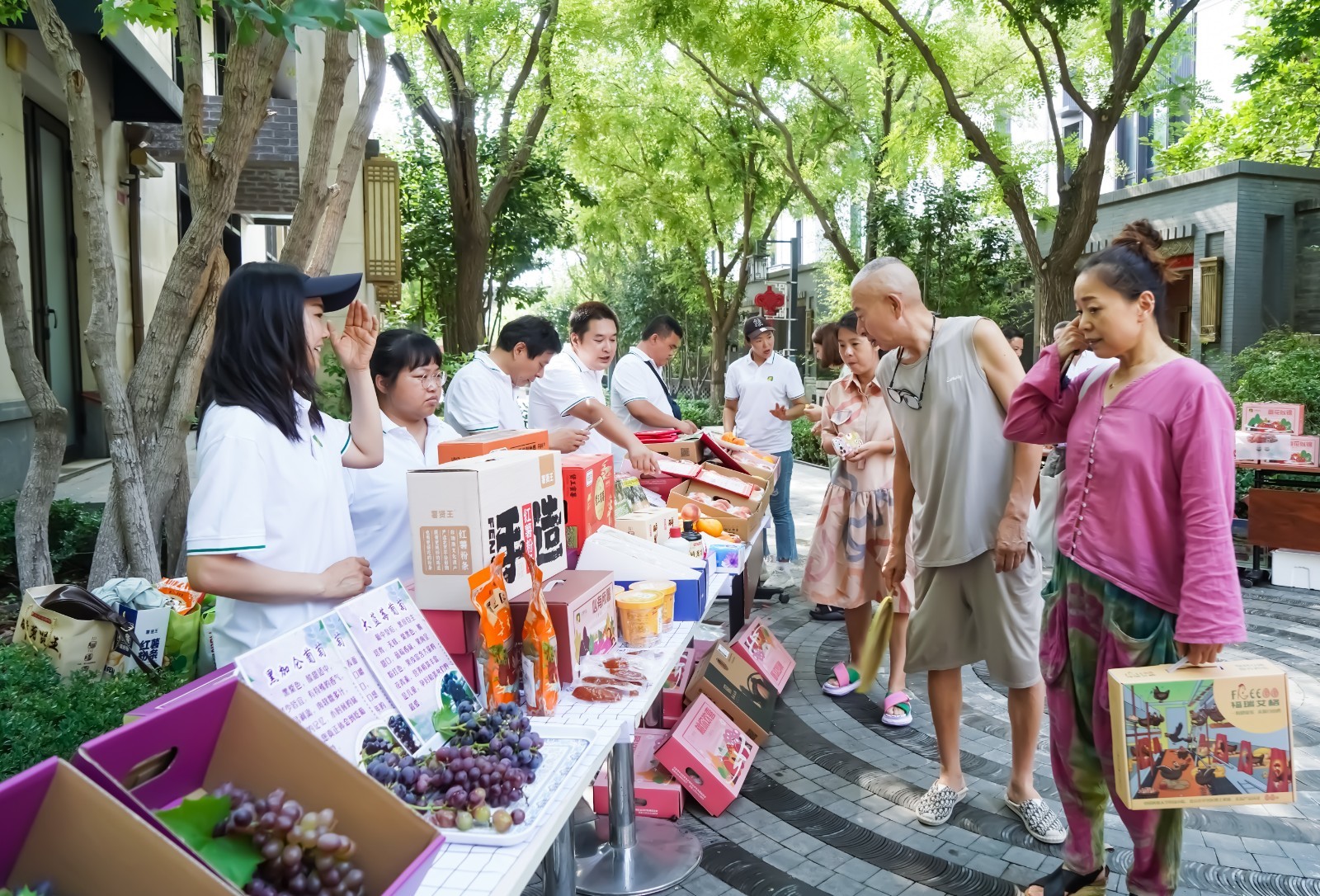 活动现场,各式各样的农产品琳琅满目,从鲜美的油桃、红薯到晶莹剔透的葡萄,再到独具匠心的牙木雕工艺品,无不展现出夏各庄镇丰富的农业资源和深厚的文化底蕴。特别是“在夏有礼”品牌,根据夏各庄镇农产品特色,重点打造了6个系列品牌伴手礼,有蔬果系列的时令果蔬组合产品,有红薯系列的红薯、红薯粉、红薯加工产品等,深受泰禾北京院子居民的青睐,当天几乎抢购一空。