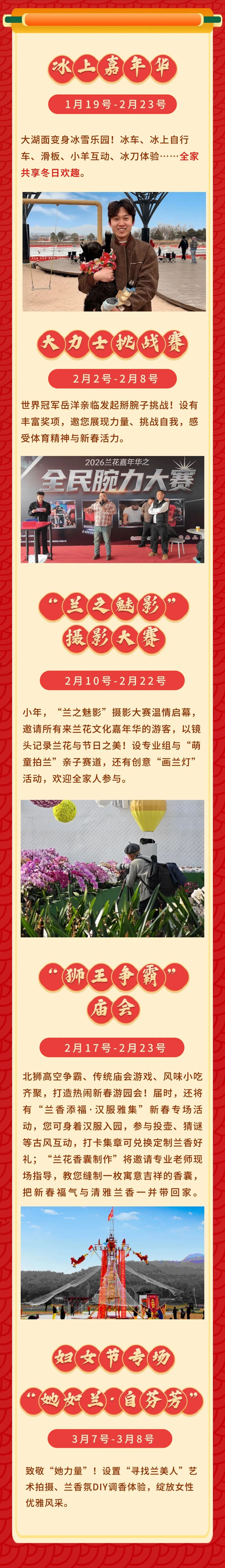 接下来,更有冰雪嘉年华、大力士挑战赛、摄影大赛、春节庙会、妇女节专项系列活动接力登场,陪您温暖过冬,乐享兰艺生活!