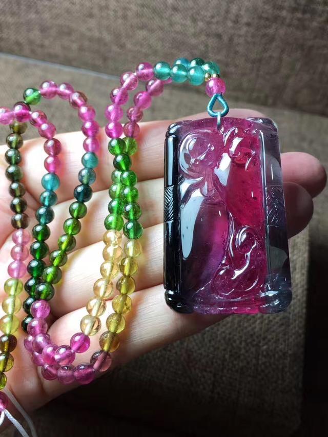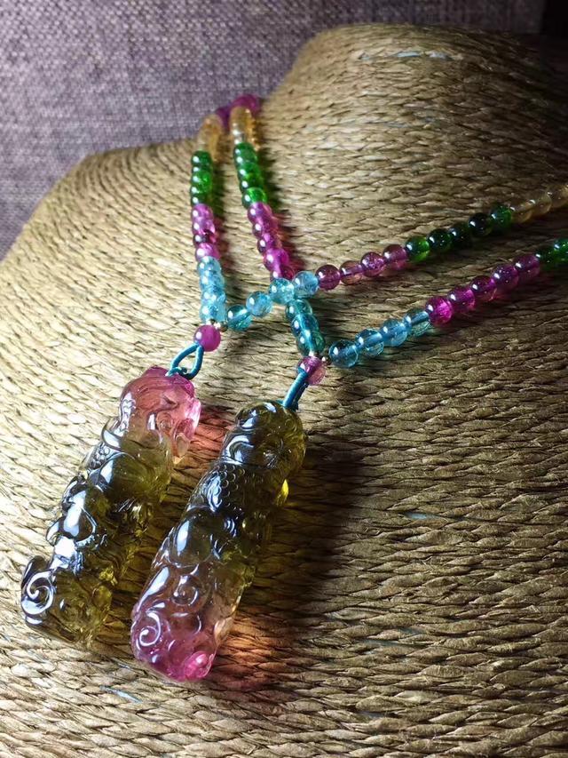 碧玺小挂件也是彩色宝石中一道亮丽的风景线,像翡翠、和田玉一样,碧玺的挂件有各种图案,如桃子、竹子等植物花卉的造型,憨态可掬的动物造型,人物造型等各种美好寓意的图案。