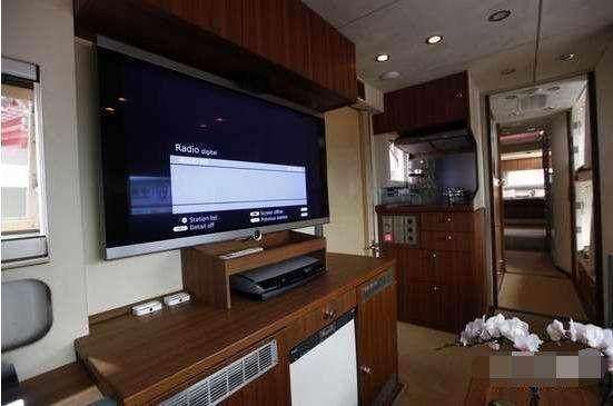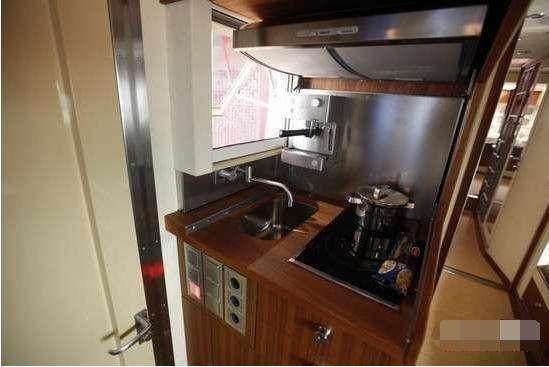 40寸的3D液晶电视,可观看卫星电视,独立控制空调,还可以开启房车的天窗欣赏天空的美景,除此之外,还配备厨房、单门冰箱,带微波功能的烤箱,吸油烟机等等。另外相比其他房车,其最大的亮点在它还配备独立的淋浴空间,并且具备恒温淋浴系统。