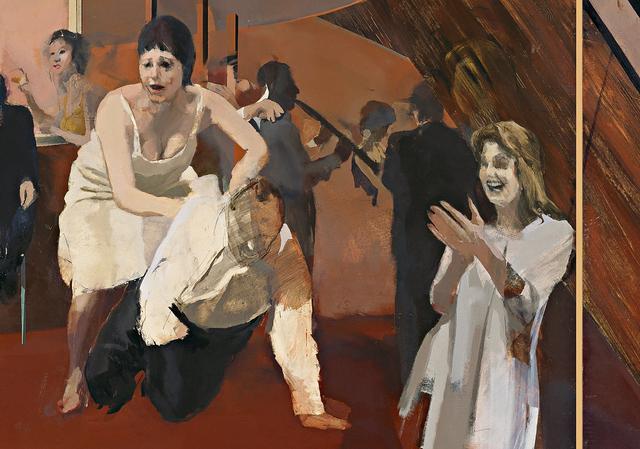 迈克尔·安德鲁(Michael Andrews)斯将室内与室外的派对场面紧紧地结合起来,在这样一个三联画效果的作品中呈现出一种扑面而来的兴奋感与视觉效果。这幅画在三十多米长的画布上铺展开来,不知名的人物在其中站着、坐着、躺着、甚至爬着。