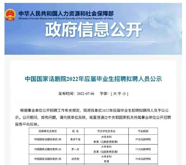 7月6日,人社部官网发布《中国国家话剧院2022年应届毕业生招聘拟聘人员公示》。公示显示,易烊千玺、罗一舟、胡先煦,考入演员一岗。按照规定,7月15日前,若无相关问题反映,三位艺人将正式成为中国国家话剧院演员。
