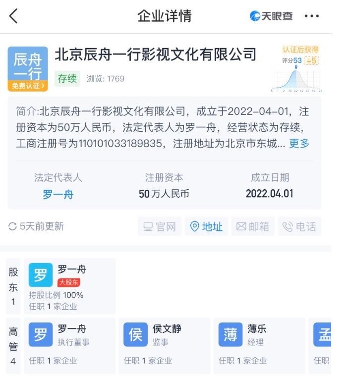 而公开资料显示,罗一舟是成立于2022年4月的北京辰舟一行影视文化有限公司的法定代表人。