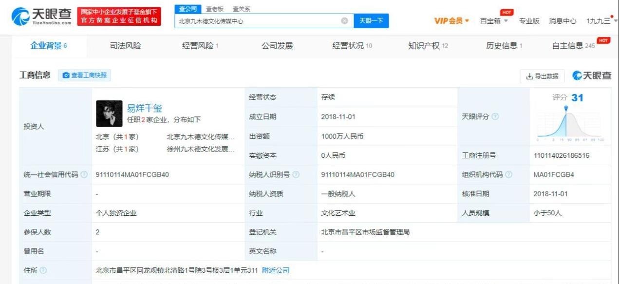 记者查询发现,北京九木德文化传媒中心于7月4日发布注销公告,该传媒中心成立于2018年11月,注册资本为1000万元人民币,为易烊千玺个人独资企业。有网友猜测此举与易烊千玺考编有关。