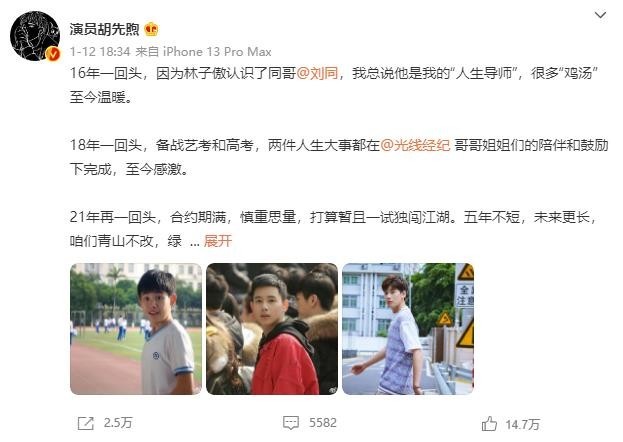 胡先煦2016年签约光线传媒,并于2022年1月12日在社交平台发文告别光线传媒,不再与其续约。