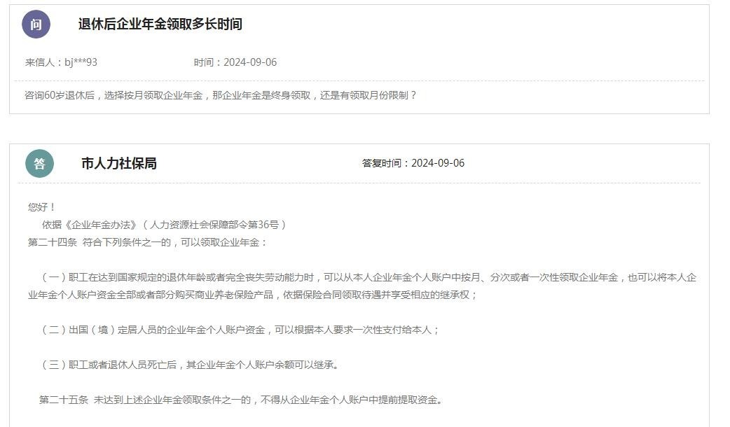 近日有市民提问:60岁退休后,选择按月领取企业年金,那企业年金是终身领取,还是有领取月份限制?