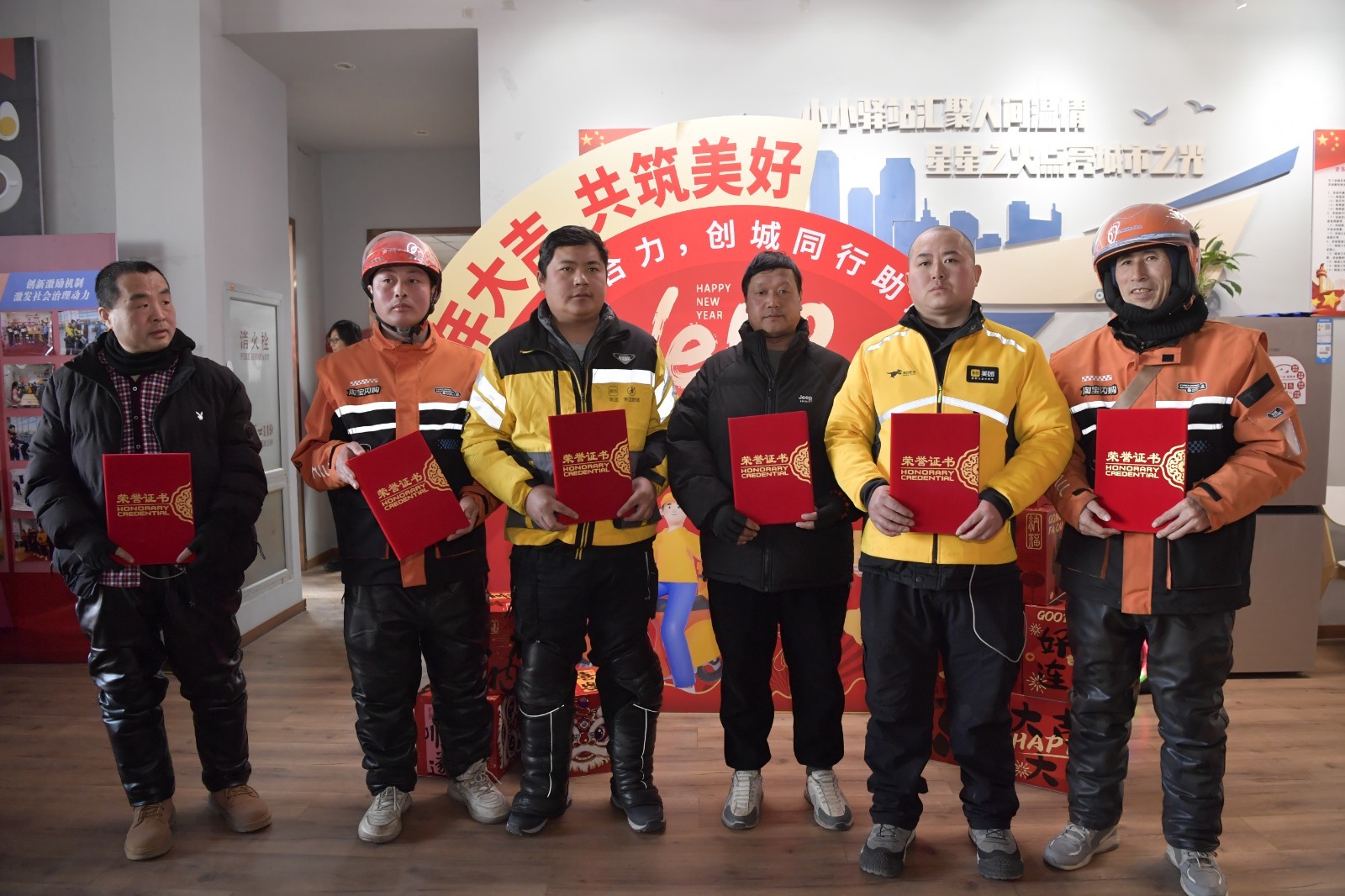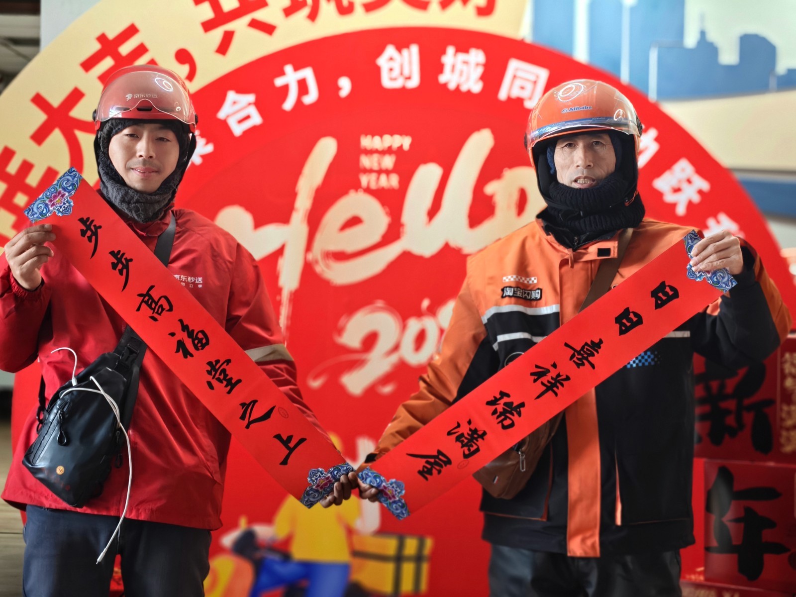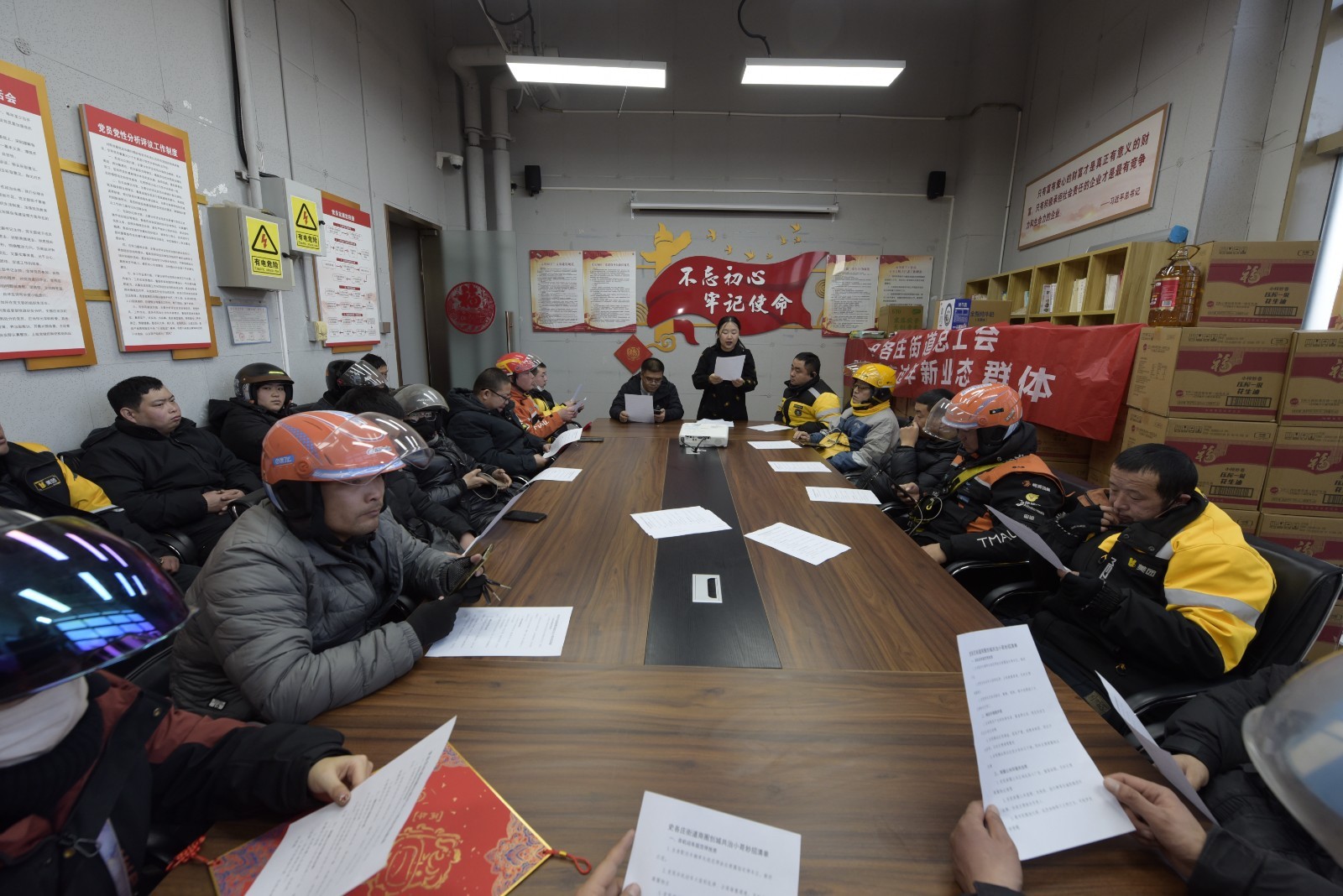 街道领导现场宣读致辖区新业态新就业群体的感谢信,向小哥致以新春祝福与崇高敬意,细数大家在创城监督、文明宣传、无偿献血等公益行动中的付出,发出争当文明践行者、创城监督员、邻里志愿者的倡议,并承诺持续完善暖新驿站服务功能,为小哥提供贴心保障。