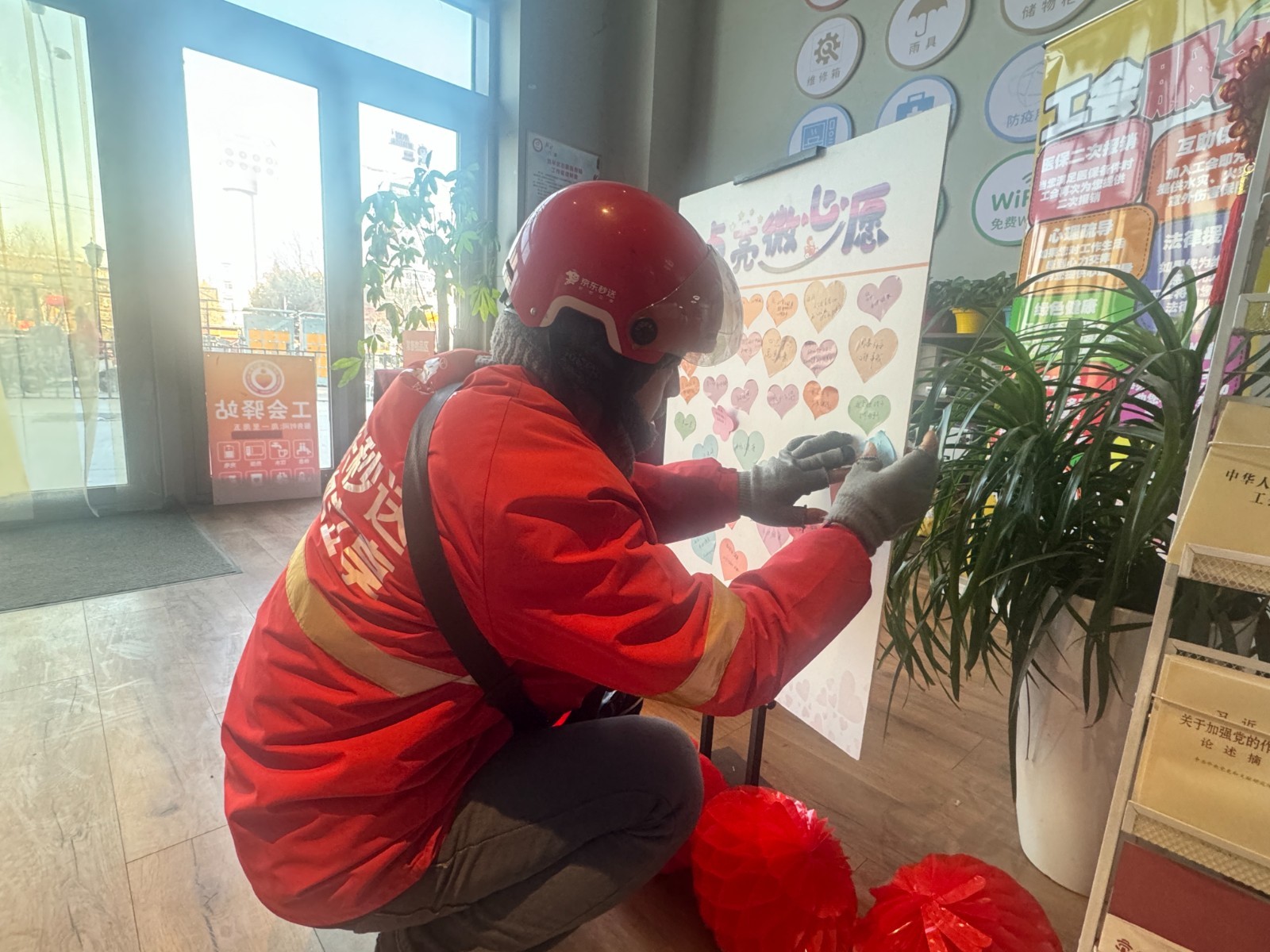 珠江摩尔暖新驿站年味浓郁,辖区新就业群体代表齐聚于此。签到环节,小哥领取定制创城妙招便利贴,写下新春心愿、急难愁盼诉求,还结合配送经验为商圈治理提“金点子”,同时体验福字拓印、拍摄年味福照,感受节日关怀。