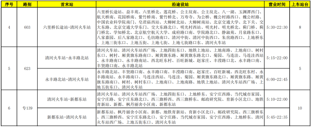 这6条线路与途经上地东路的521路,共同承担清河火车站地面公交服务功能。与枢纽站启用前相比,新增清河火车站前往北京西站、中关村、北安河、软件园、唐家岭等多个地面公交服务方向。